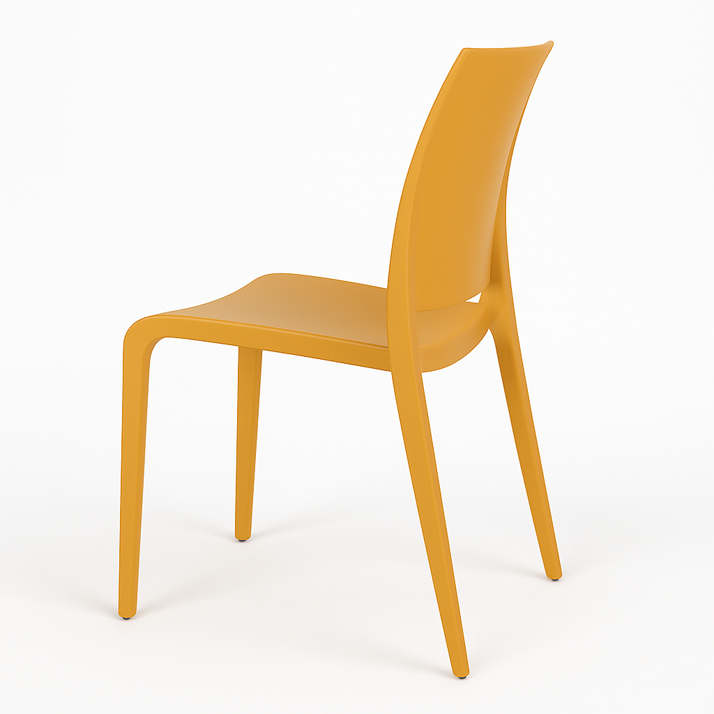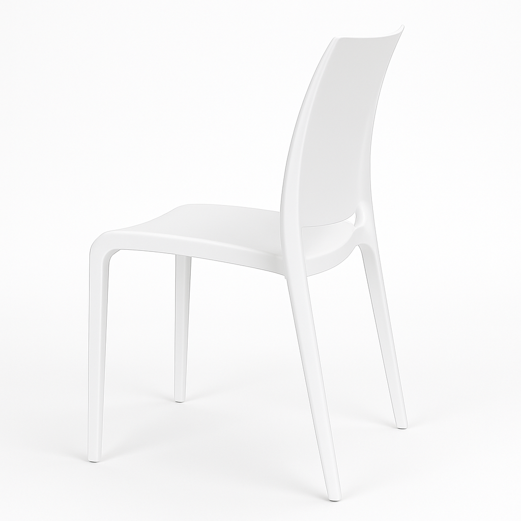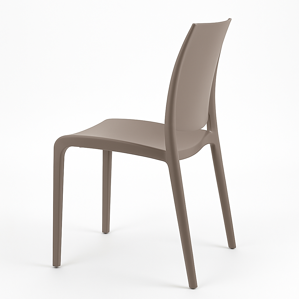 Sedia impilabile in polipropilene e fibra di vetro con tappi antiscivolo. Ideale per uso interno ed esterno.