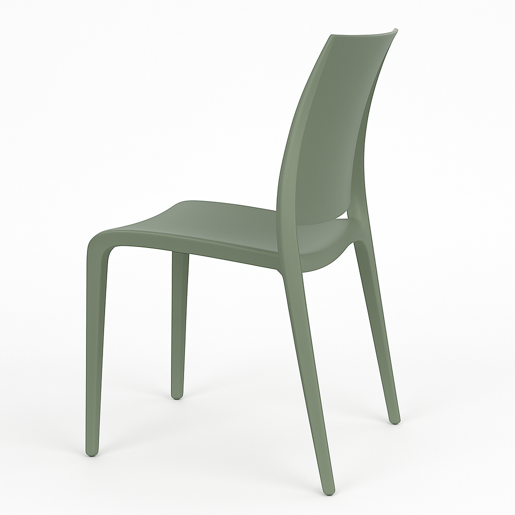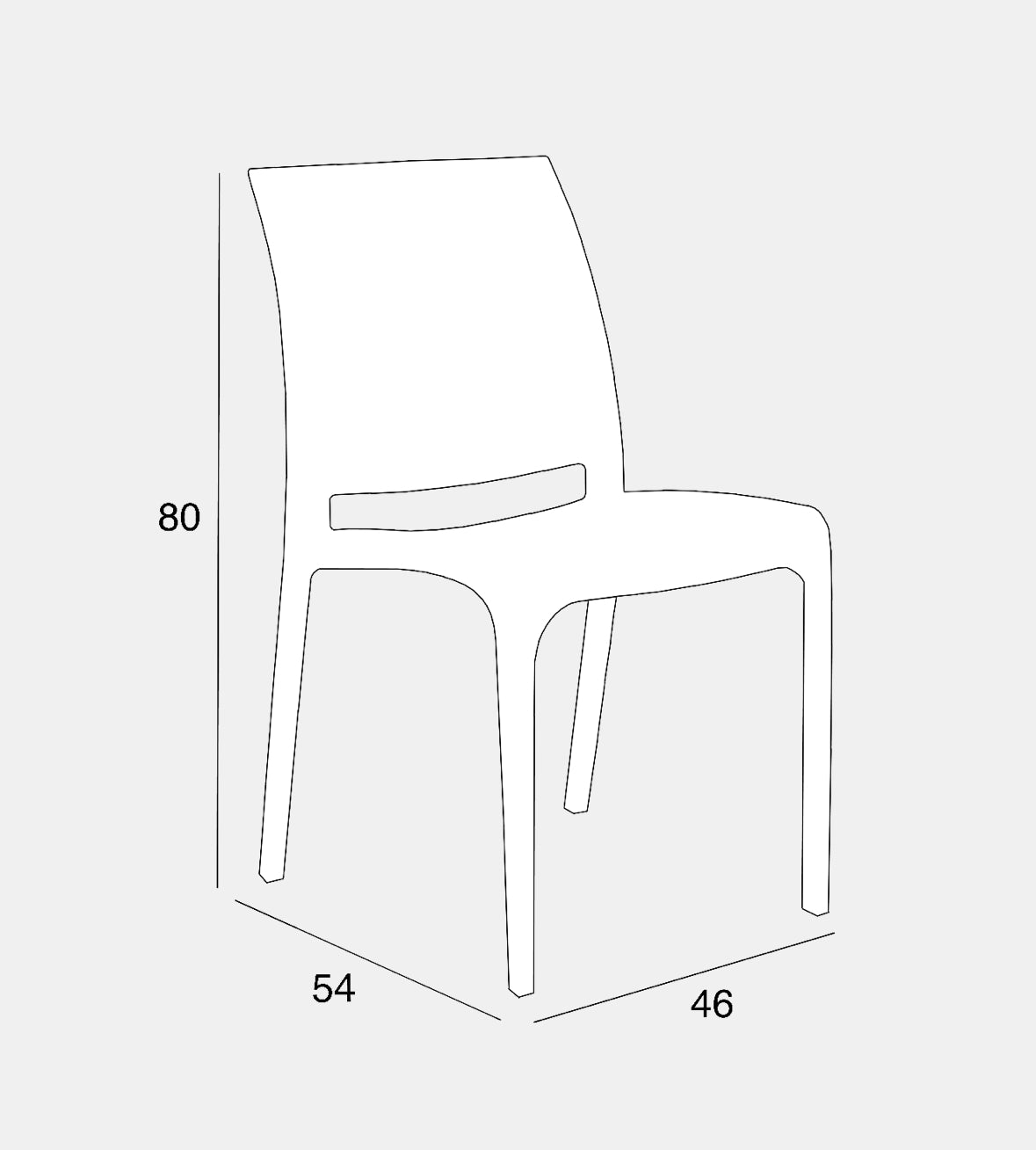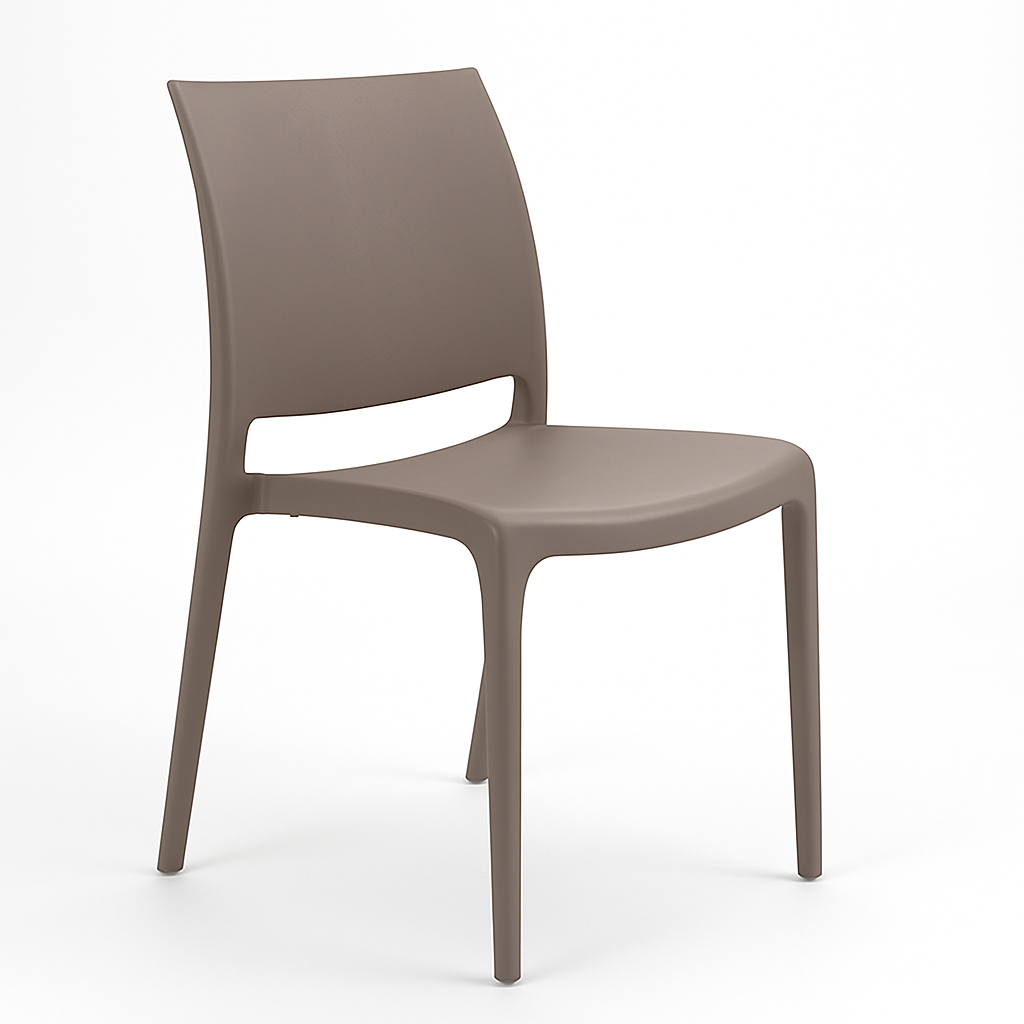 Sedia impilabile in polipropilene e fibra di vetro con tappi antiscivolo. Ideale per uso interno ed esterno.